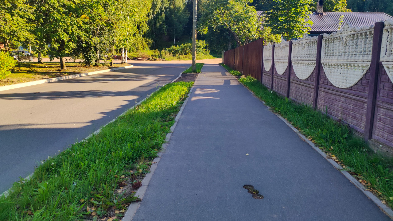 Кадр показывает тротуар в частном секторе: асфальтовая дорожка тянется вдоль забора, рядом узкая полоса травы и бордюр, слева проходит проезжая часть. На переднем плане заметно тёмное пятно на покрытии и мелкий мусор, дальше видны стыки и фактура асфальта. Забор справа с воротами и секциями, за ним двор и постройки; вдоль улицы стоят опоры и натянуты провода. Солнечный свет подчёркивает длинные тени и неровности. Фото подойдёт для тем про состояние тротуаров, обслуживание улиц и благоустройство.