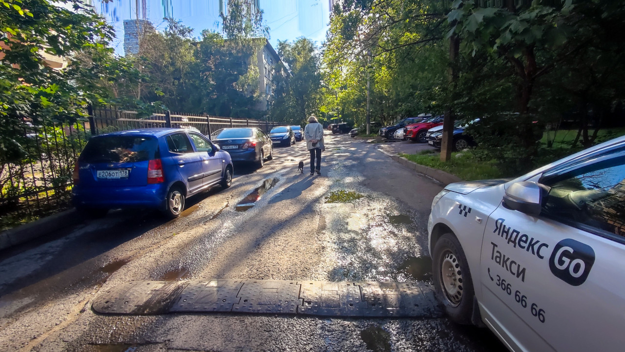 придомовая территория двор дворовая территория двор жилого дома жилой двор жилой квартал спальный район городской двор городская среда благоустройство территория около дома транспорт легковой автомобиль такси Yandex Go парковка дворовой проезд асфальт лужа отражения лежачий полицейский дорожная неровность разметка жилой район люди прогулка с собакой собака поводок тротуар забор деревья зелень летний день солнечный свет коммунальная инфраструктура безопасность движения повседневная жизньПохожие фотографии
