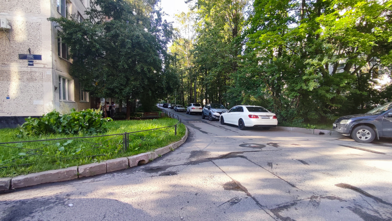 Поворот дворового проезда с припаркованными автомобилями, ограждением и зелёной зоной у многоэтажки