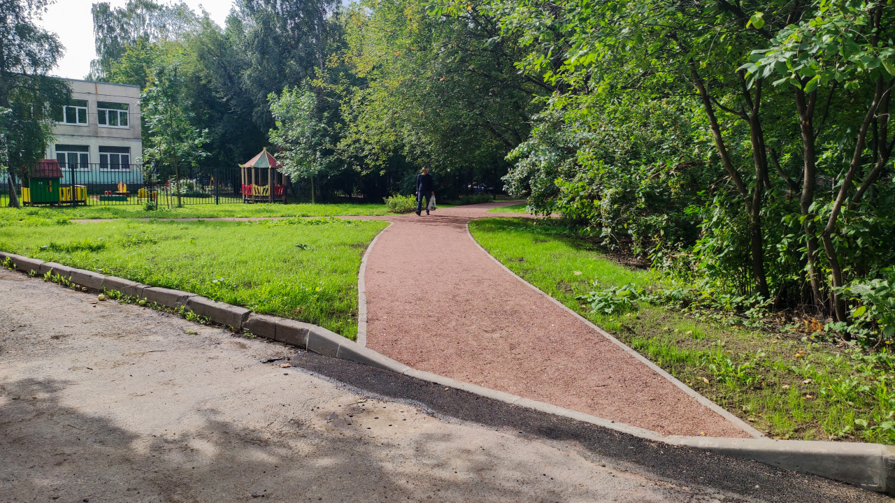 придомовая территория двор дворовая территория двор жилого дома жилой двор жилой квартал спальный район городской двор городская среда благоустройство территория около дома город парк прогулка пешеходная дорожка красная дорожка покрытие общественное пространство зелёная зона деревья тени газон бордюр человек прохожий повседневная жизнь детская площадка игровая площадка ограждение высокий забор безопасность жилой район инфраструктура урбанистика семейный отдых маршрут тропинкаПохожие фотографии