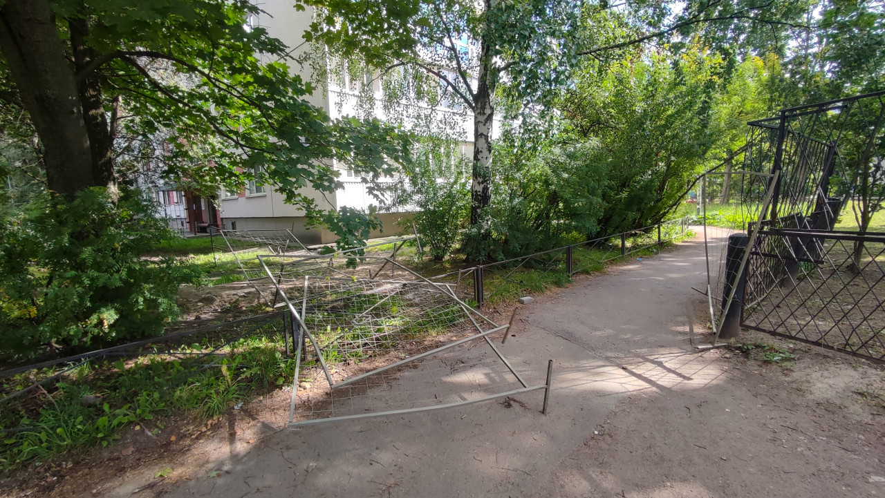 придомовая территория двор дворовая территория двор жилого дома жилой двор жилой квартал спальный район городской двор городская среда благоустройство территория около дома город аварийная ситуация безопасность препятствие упавший забор временное ограждение металлический забор секции забора тротуар пешеходный проход опасность ремонт строительные работы нарушение контроль подрядчика жилой дом многоэтажка входная группа поручень газон кусты деревья песок листья коммунальные службыПохожие фотографии