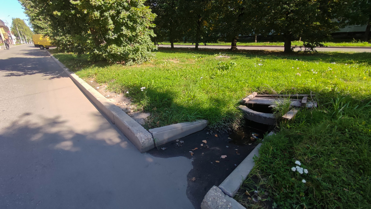 инфраструктура городская среда улица инженерные сооружения благоустройство город тротуар асфальтовая дорожка бордюр газон зелёная зона деревья кусты тени водоотвод ливневая канализация дренаж канава сток бетонное кольцо деревянный настил доски вода обочина содержание территории ЖКХ ремонт повреждение полевые цветыПохожие фотографии