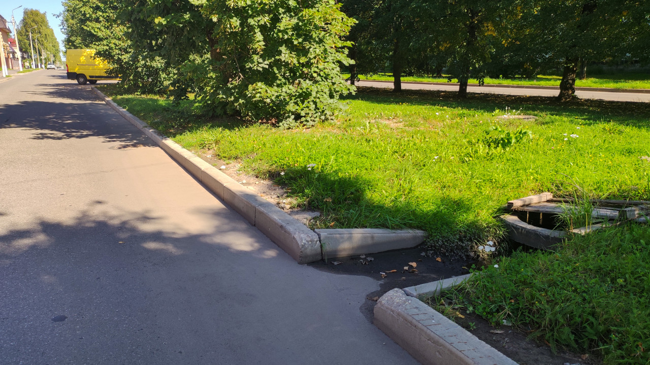 инфраструктура городская среда улица инженерные сооружения благоустройство город дорога асфальт обочина бордюр бордюрный съезд газон трава зелёная зона кусты деревья тени водоотвод водосток дренаж ливневая канализация канава бетонный лоток сток воды размытый грунт мусор повреждение ЖКХ обслуживаниеПохожие фотографии
