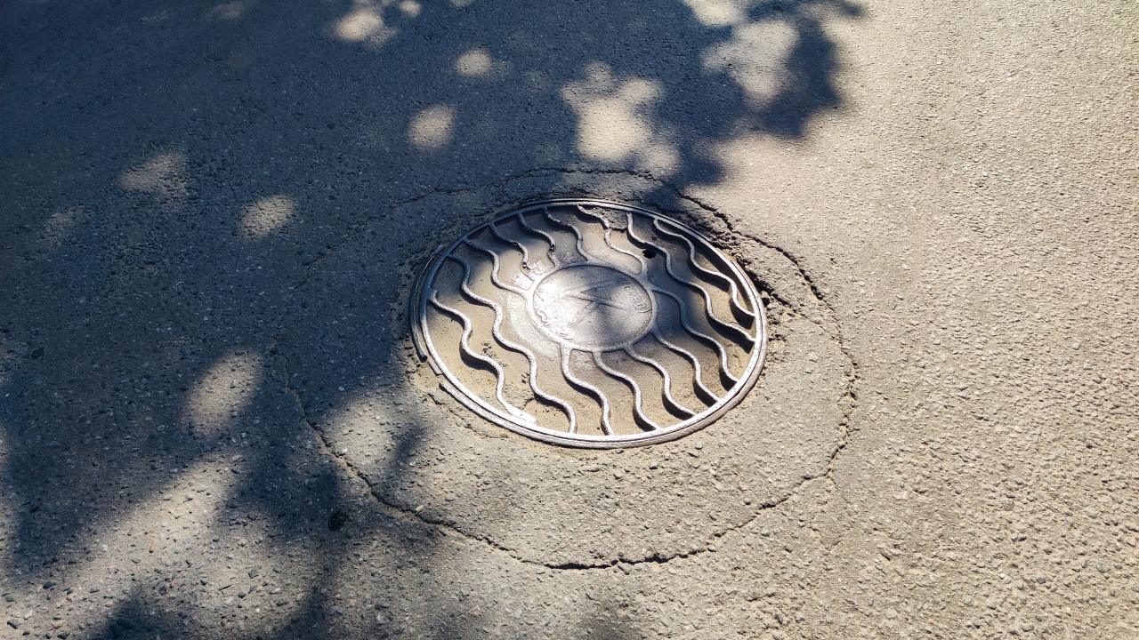 инфраструктура городская среда улица инженерные сооружения благоустройство город городская улица дорога асфальт дорожное покрытие ремонт асфальта латка трещины круглая крышка люк канализационный люк смотровой колодец чугун рельефный узор металлическая крышка коммунальные сети инженерные сети ливневая канализация водоотведение безопасность технический объект тень деревьев солнечный свет лето деталь крупный план урбанистикаПохожие фотографии
