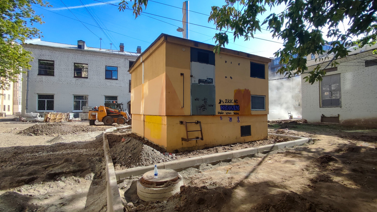 Трансформаторная подстанция на фоне ремонта двора и техники