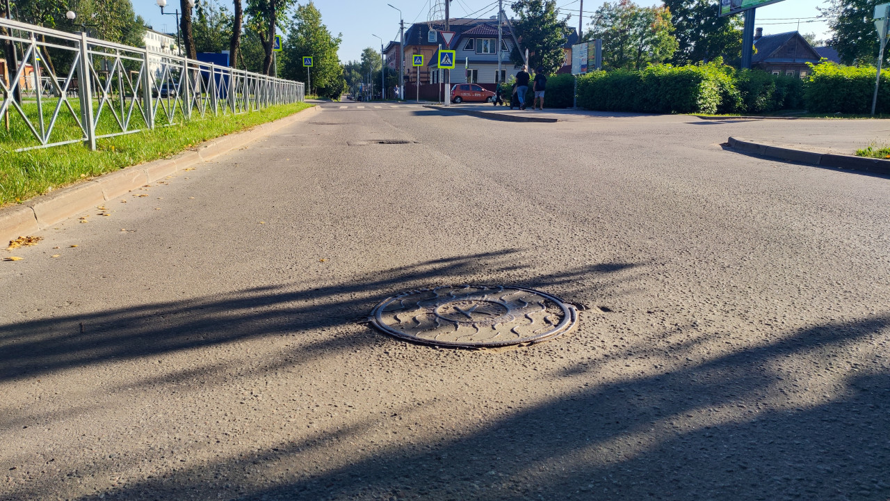 инфраструктура городская среда улица инженерные сооружения благоустройство город дорога асфальт люк чугунный люк смотровой колодец коммунальные сети уличное покрытие тротуар бордюр пешеходный переход дорожные знаки перекрёсток тени солнечная погода ограждение кусты частные дома провода опоры безопасность ремонт асфальта крупный план текстураПохожие фотографии