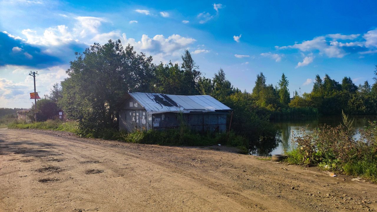 деревня село поселок сельская местность сельский пейзаж загород загородная местность пригород загородная жизнь жизнь за городом провинция сельская жизнь поселение дорога грунтовая дорога разбитая дорога выбоины лужи грязь окраина водоём пруд берег камыши растительность высокая трава кустарник деревья отражение воды металлическое строение хозпостройка крыша реклама баннер электроопора провода пасмурное небо лето проездПохожие фотографии