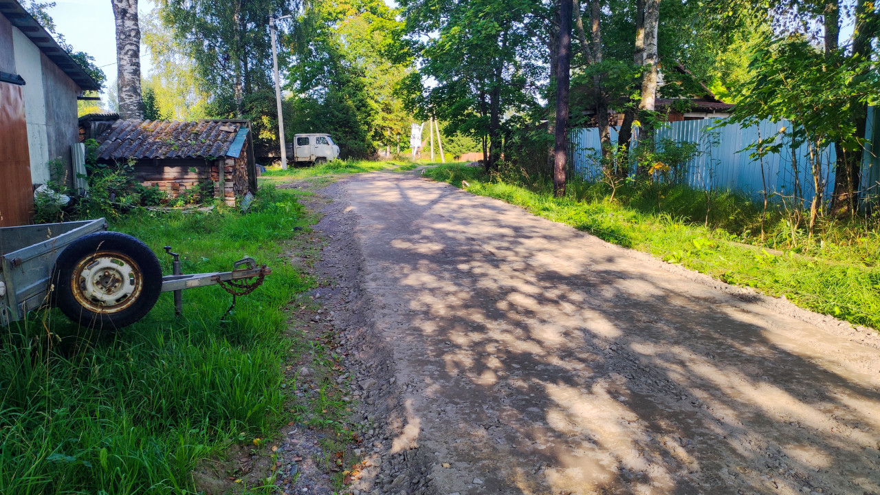 В кадре сельская или дачная улица с грунтово-щебёночным покрытием и заметными следами от колёс. На переднем плане стоит небольшой прицеп или тележка, рядом видны ограждения участков и элементы дворовой территории. В глубине различимы хозяйственные постройки и частные дома, а вдоль улицы идут опоры с проводами. По краям дороги растут трава и деревья, создавая “зелёный коридор” вдоль проезда. Съёмка выполнена днём при ярком естественном освещении. Фото подходит для тем о загородной инфраструктуре и бытовой логистике.