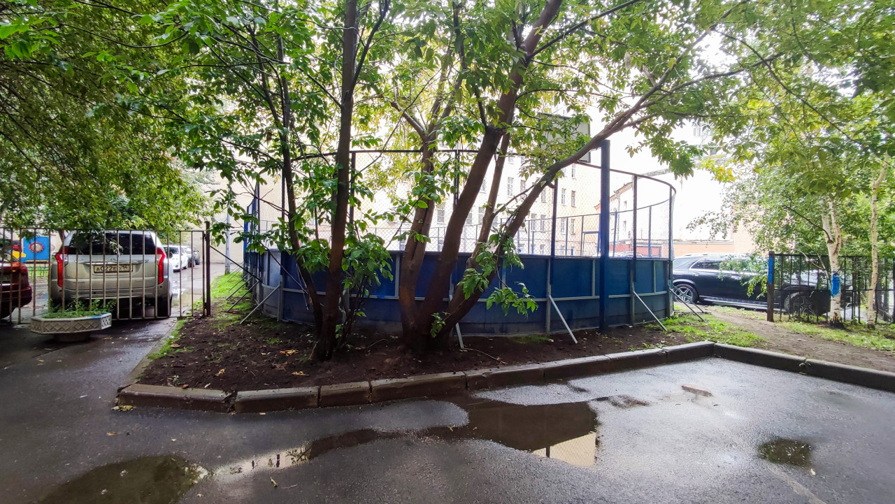 город городская среда жилой район городская инфраструктура инфраструктура благоустройство общественное пространство двор дворовая территория спорт уличный спорт спортивная площадка дворовая инфраструктура спортсооружение ограждение сетка синяя коробка многоквартирный дом деревья зеленая зона асфальт лужи после дождя бордюр проезд парковка автомобили повседневная жизнь безопасность урбанистика детская площадка благоустройство территорииПохожие фотографии
