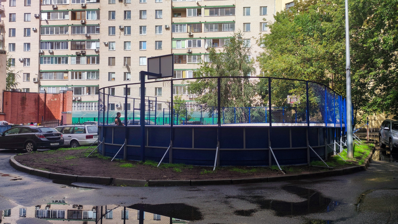 город городская среда жилой район городская инфраструктура инфраструктура благоустройство общественное пространство двор дворовая территория спорт уличный спорт спортивная площадка многоквартирный дом панельный дом универсальная площадка баскетбол баскетбольное кольцо ограждение металлический забор сетка рабица резиновое покрытие красное покрытие асфальт лужи после дождя парковка во дворе автомобили деревья зелень спорт во дворе реконструкция двора безопасностьПохожие фотографии