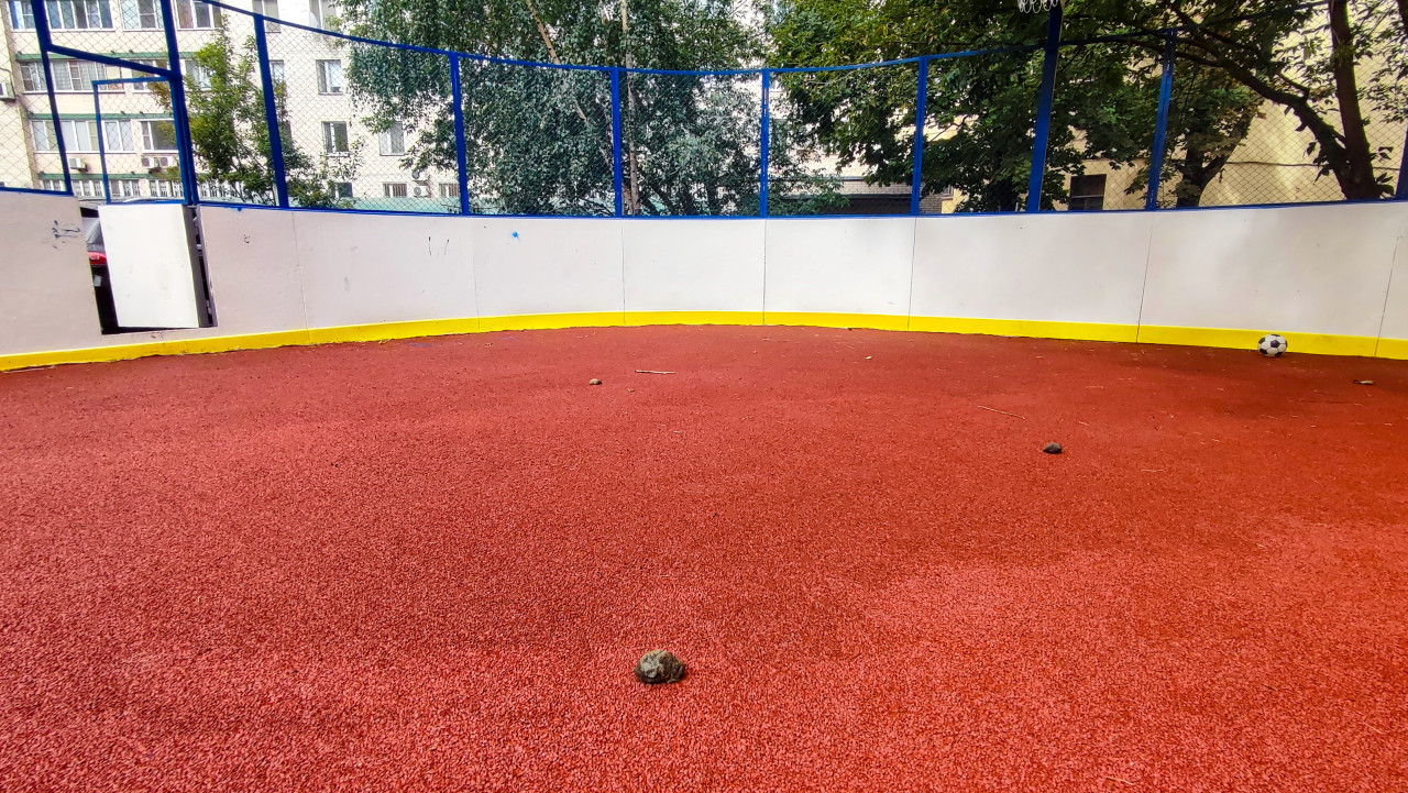город городская среда жилой район городская инфраструктура инфраструктура благоустройство общественное пространство двор дворовая территория спорт уличный спорт спортивная площадка хоккейная коробка уличная арена резиновое покрытие резиновая крошка красное покрытие борта ограждение сетчатый забор футбольный мяч деревья тени камень камни на площадке мусор веточки загрязнение уборка территории безопасность травмоопасность коммунальные службы обслуживание площадки дворовые игрыПохожие фотографии