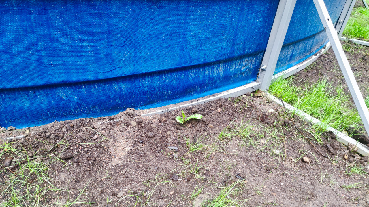 Крупный план нижней части ограждения спортивной площадки: синяя панель с выраженной фактурой и потёками, металлический профиль у основания и боковая стойка каркаса. Перед ограждением лежит свежая насыпь земли с мелкими камнями и редкой травой, видны следы подсыпки и выравнивания почвы возле опоры. Справа частично попадает треугольная подпорка, которая удерживает конструкцию на месте. Фотография подходит для материалов о ремонте и обслуживании дворовых спортивных площадок, укреплении ограждений, борьбе с размывом грунта и восстановлении газонов в городской среде.