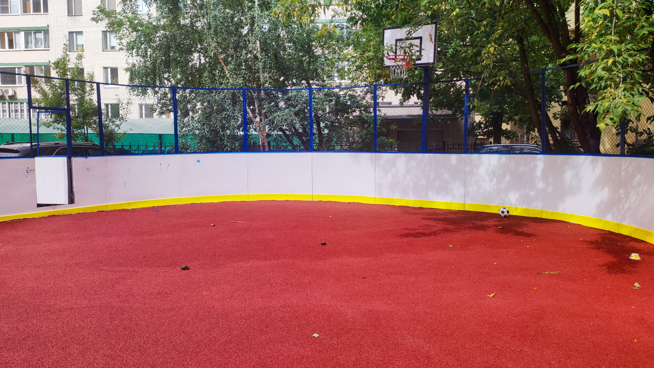город городская среда жилой район городская инфраструктура инфраструктура благоустройство общественное пространство двор дворовая территория спорт уличный спорт спортивная площадка универсальная площадка баскетбол баскетбольное кольцо мини футбол футбольный мяч резиновое покрытие красное покрытие борта ограждение сетка безопасность тени деревьев влажные следы зеленая зона окна домов автомобили дворовые игры детский спорт подростки активный отдых площадка во дворе смешанные игрыПохожие фотографии