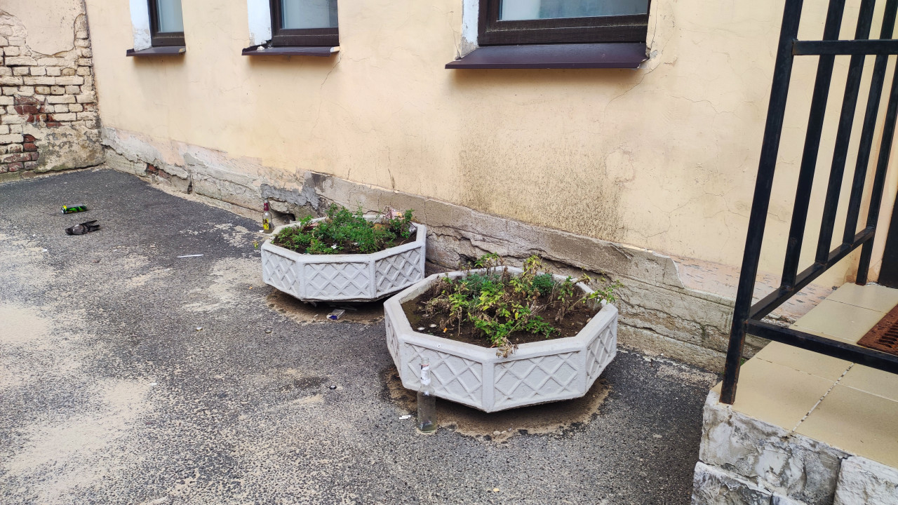 На фото запечатлён фрагмент двора у жилого дома: несколько крупных кашпо с цветами стоят на асфальте вдоль стены, рядом зелёные кусты и трава. Видны элементы фасада и цоколя, небольшие загрязнения покрытия и бытовые детали придомовой территории. Сцена передаёт аккуратное локальное озеленение и декоративное оформление входной зоны без сложных конструкций. Такой кадр подходит для тем о благоустройстве, дворовом декоре, городской среде и инициативном озеленении возле многоквартирных домов. Использование: статьи ЖКХ, управляющие компании, ландшафтные заметки, городские проекты.