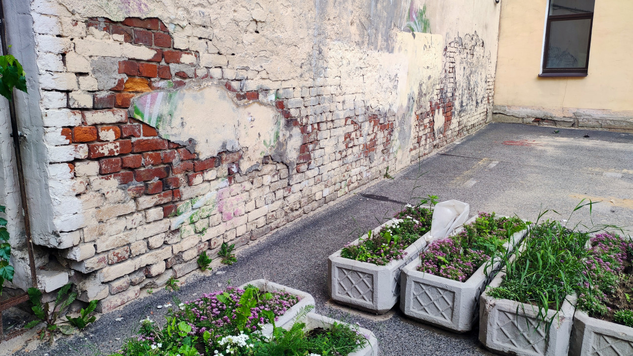 В кадре двор у здания: длинная кирпичная стена частично покрыта старой штукатуркой, местами она осыпалась и открыла кладку; заметны следы выцветшего граффити и пятна ремонта. Вдоль асфальтовой дорожки стоят бетонные вазоны с рельефным узором, в них растут розовые и белые цветы, зелёные листья и сорняки; в одном контейнере лежит белый пакет. Справа виден участок фасада с окном и цоколем, у основания стены пробивается трава. Снимок сделан днём и показывает простое дворовое озеленение на фоне изношенной отделки. Подойдёт для тем о городском благоустройстве, уличном декоре и уходе за придомовой территорией.