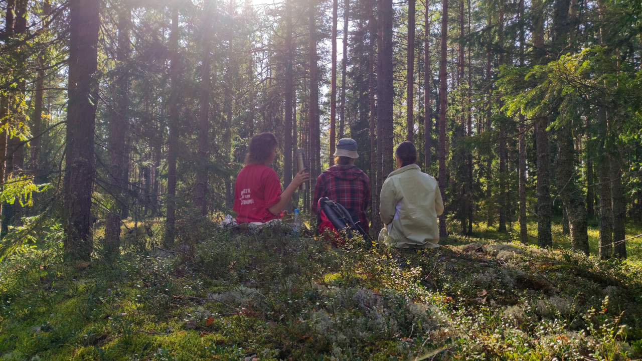 Трое людей отдыхают на лесной поляне среди хвойных деревьев в солнечный день