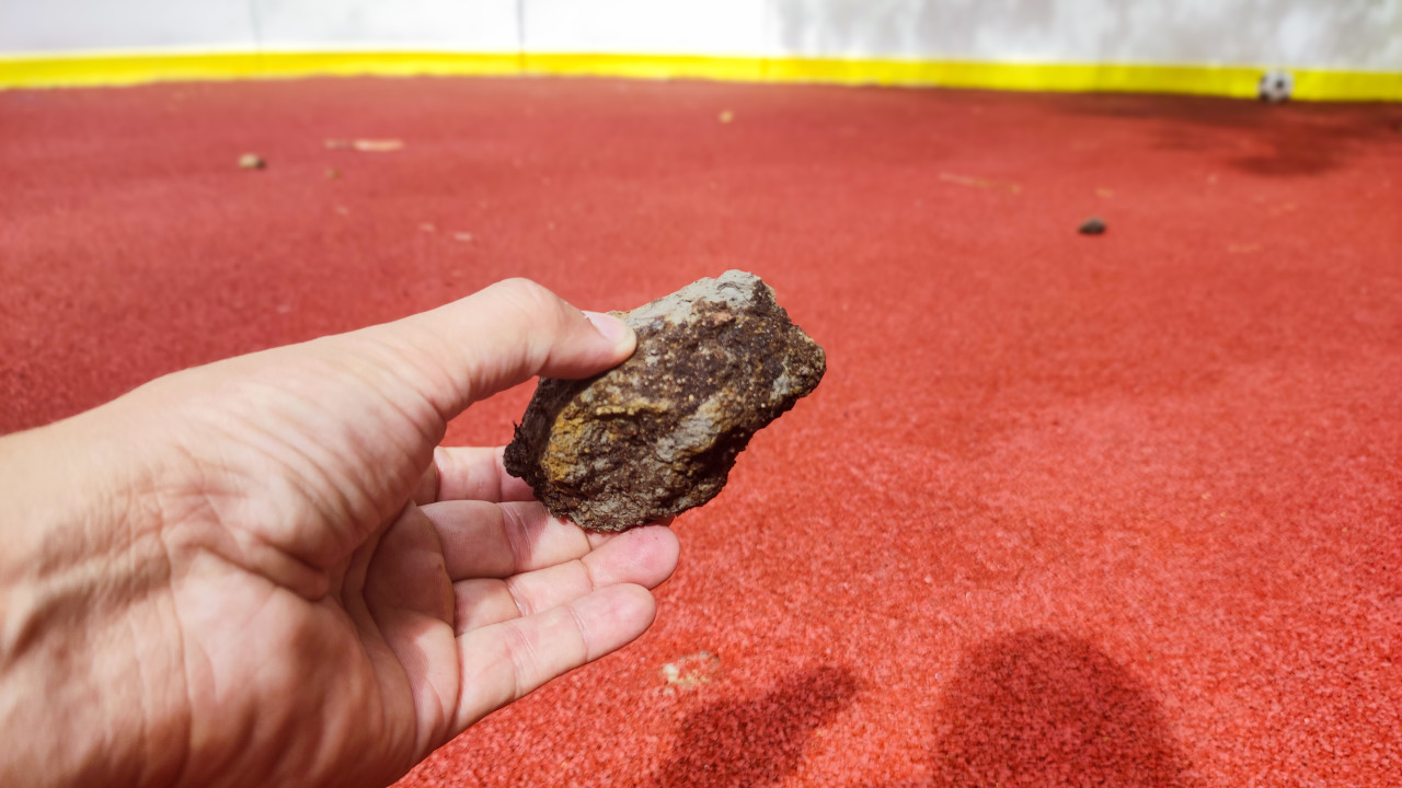 Рука держит камень, поднятый с покрытия спортивной площадки