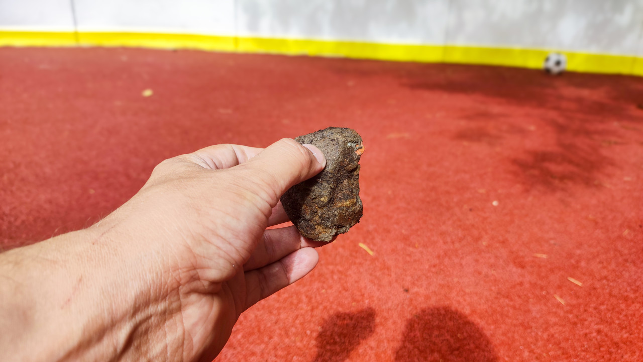 Крупный план руки с камнем на фоне красной резиновой крошки спортивной площадки. Камень тёмный, с неровной поверхностью и вкраплениями, выглядит как посторонний предмет, найденный на покрытии. На заднем плане видны белые борта с жёлтой полосой и размытый футбольный мяч у стены, на поверхности лежат мелкие листья и сор. Фотография передаёт идею ручной проверки состояния площадки и выявления опасных предметов. Подойдёт для иллюстраций к темам безопасности детей, обслуживания дворовых объектов, уборки территорий и ответственности управляющих компаний.