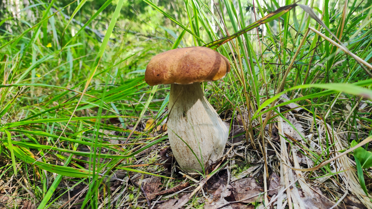 Крупным планом показан белый гриб (боровик) с коричневой шляпкой и массивной светлой ножкой, растущий среди высокой травы, мха и опавшей листвы на лесной подстилке. В кадре заметны тонкие стебли, переплетение травинок, небольшие веточки и тёмная влажная почва у основания ножки; задний план мягко размывается и подчёркивает силуэт гриба. Свет естественный дневной, без жёстких теней, характерный для тенистого участка леса. Снимок можно использовать в материалах о съедобных грибах, «тихой охоте», экологии леса, сезонных заготовках и туристических маршрутах.