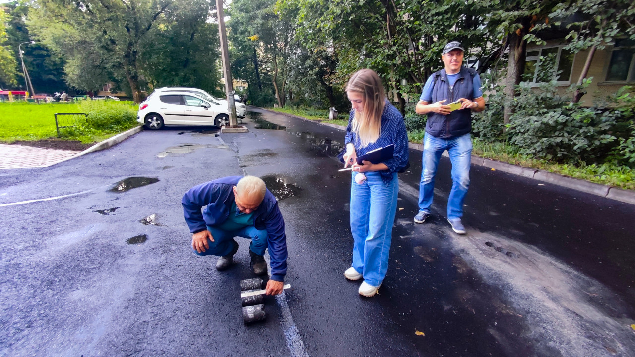 люди городская среда инфраструктура дорога асфальт дорожное покрытие дорожные работы контроль качества строительный контроль технический надзор измерение асфальтовое покрытие кернение отбор керна керн асфальта измерение толщины рулетка линейка образцы проверка покрытия экспертиза инспектор документация блокнот ручка рабочая одежда мокрый асфальт лужи городской проезд припаркованная машина деревья обсуждение ремонт дороги коммунальные работыПохожие фотографии