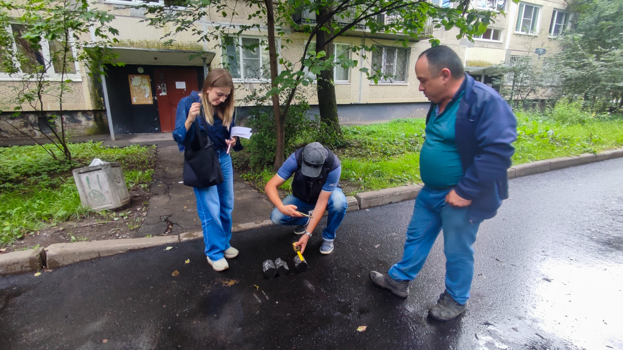 люди городская среда инфраструктура дорога асфальт дорожное покрытие дорожные работы контроль качества строительный контроль технический надзор измерение керн керн асфальта измерение рулеткой линейка контроль толщины документация блокнот ручка инженер проверка качества ремонт покрытия мокрый асфальт лужи крупный план образец материала слои дорожной одежды отверстие после кернения городской проезд спецодежда коммунальные службы безопасность работ контроль приемки диагностика дороги летоПохожие фотографии