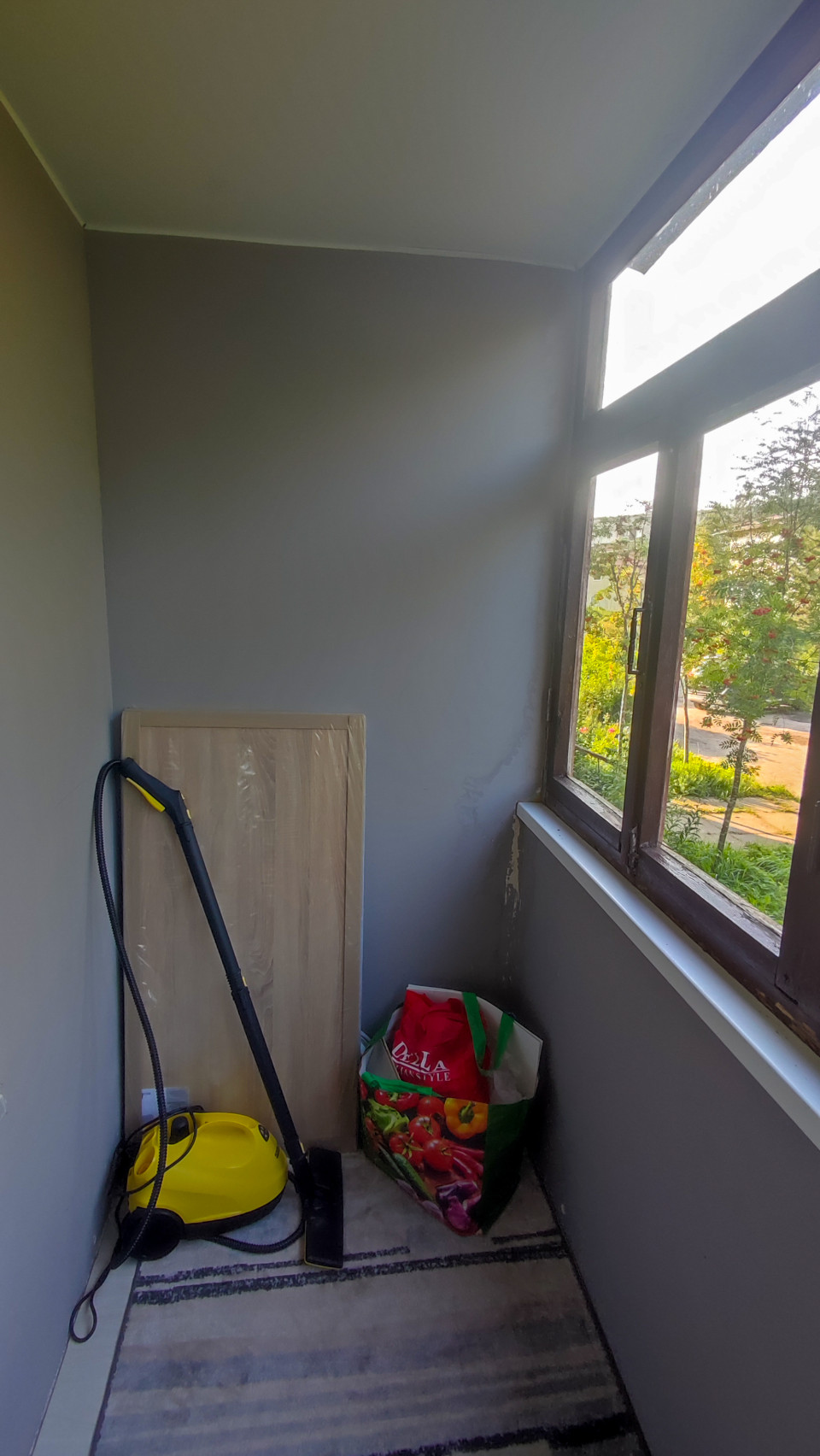 строительство жильё многоквартирный дом лоджия балкон квартира интерьер хозяйственная зона уборка техника для уборки пароочиститель моющий аппарат шланг насадки бытовая техника хранение вещи пакеты доска панель коврик окно стеклопакет серые стены домашний быт порядок ремонт отделка балконное пространство тесное помещение дневной свет практичностьПохожие фотографии
