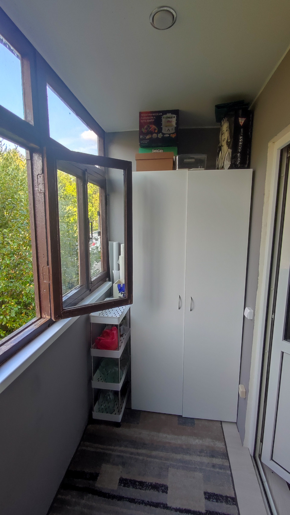 На фотографии обжитая лоджия: вдоль стены стоит высокий белый шкаф, рядом стеллаж с корзинами и коробками для хранения. Окно открыто, через стекло видно зелёные деревья и двор, на полу лежит коврик, а у стены заметны мелкие бытовые предметы. Серые стены и аккуратная расстановка вещей подчёркивают, что помещение используется как кладовая и место для сезонного хранения. Дневной свет идёт через остекление, создавая мягкие тени на мебели. Снимок подойдёт для тем про хранение на балконе, остекление и отделку лоджий, домашнюю организацию пространства.