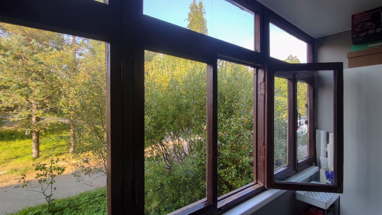 Открытое окно на лоджии и вид на зелёные деревья за стеклом