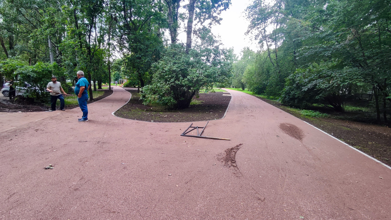 благоустройство благоустройство территории стройплощадка строительная площадка строительные работы строительство строительный участок город парк лесопарк зеленая зона пешеходная зона пешеходная дорожка тротуар ремонт ландшафтные работы устройство дорожек отсыпка минеральная крошка отсев гравий выравнивание планировка поверхности ручной труд рабочие строительный инвентарь грабли лопата правило кромка дорожки кустарники деревья детская площадкаПохожие фотографии