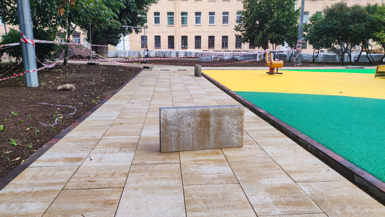 В кадре участок дворового благоустройства: широкая пешеходная дорожка выложена прямоугольной плиткой, по центру стоит тяжёлый бетонный блок-лавка. Справа начинается детская зона с резиновым покрытием зелёного и жёлтого цветов и пружинной качалкой, по краю проходит бордюрный камень. Территория частично ограждена красно-белой сигнальной лентой, вокруг свежий грунт с небольшими ростками и посадками, вдалеке лежат упакованные материалы и виден фасад здания с окнами. Фото уместно для статей о ремонте дворов, укладке тротуарной плитки и организации общественных пространств.