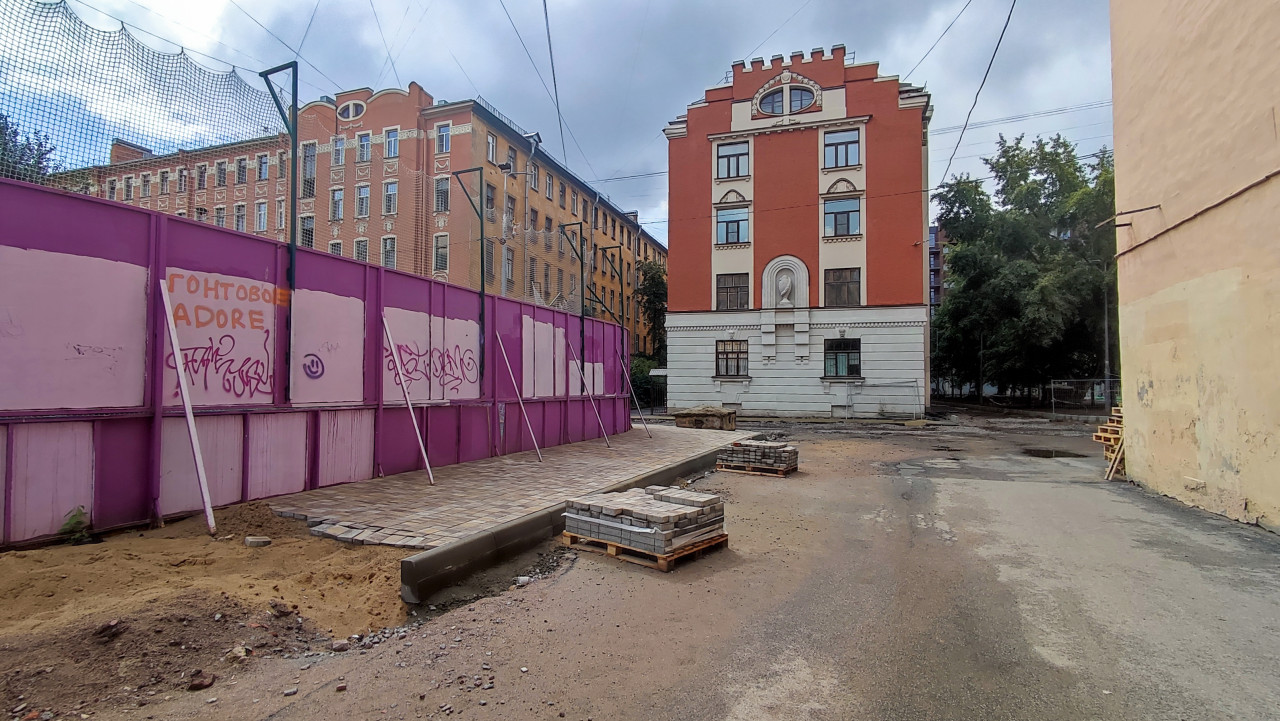 благоустройство благоустройство территории стройплощадка строительная площадка строительные работы строительство строительный участок город двор дворовая территория инфраструктура ремонт реконструкция дорожные работы тротуар пешеходная зона тротуарная плитка укладка плитки мощение бордюр бордюрный камень поддон паллета стройматериалы складирование песок грунт колеи ограждение спортивная площадка сетка металлические стойки жилые дома урбанистикаПохожие фотографии