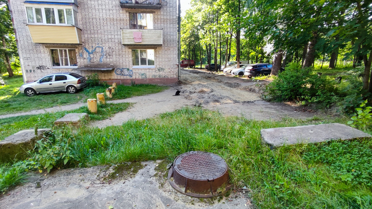 Двор жилого дома с люком колодца и разрытым проездом перед началом коммунального ремонта
