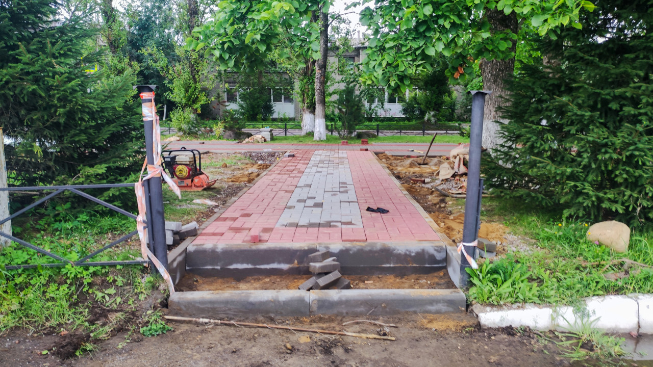 благоустройство благоустройство территории стройплощадка строительная площадка строительные работы строительство строительный участок ремонт пешеходная дорожка аллея тротуарная плитка укладка плитки мощение швы плитки бордюр виброплита уплотнение строительное оборудование подготовка основания песок пандус ступени ограждение столбики сигнальная лента безопасность парк деревья побелка деревьев общественное пространство ремонт тротуара городская инфраструктура дорожные работыПохожие фотографии