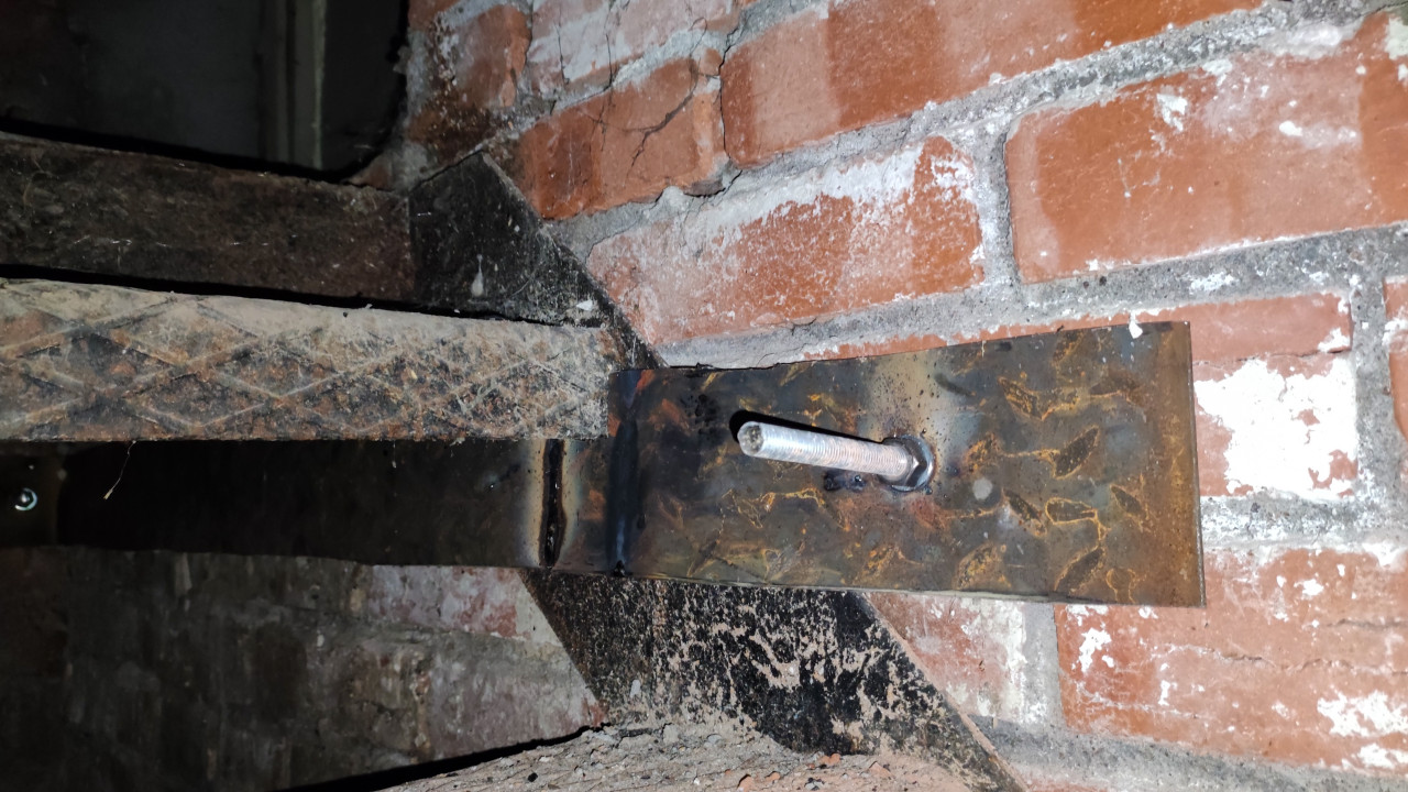 строительство ремонт реконструкция интерьер помещение металлоконструкции крепёж крепление к стене сварка сварной шов стальная пластина резьбовая шпилька гайка балка кирпичная стена кирпичная кладка трещины швы раствора окалина следы нагрева пыль загрязнение техническое помещение усиление конструкций монтаж строительный контроль обследование качество работ крупный план детали промышленный интерьер индустриальный стильПохожие фотографии