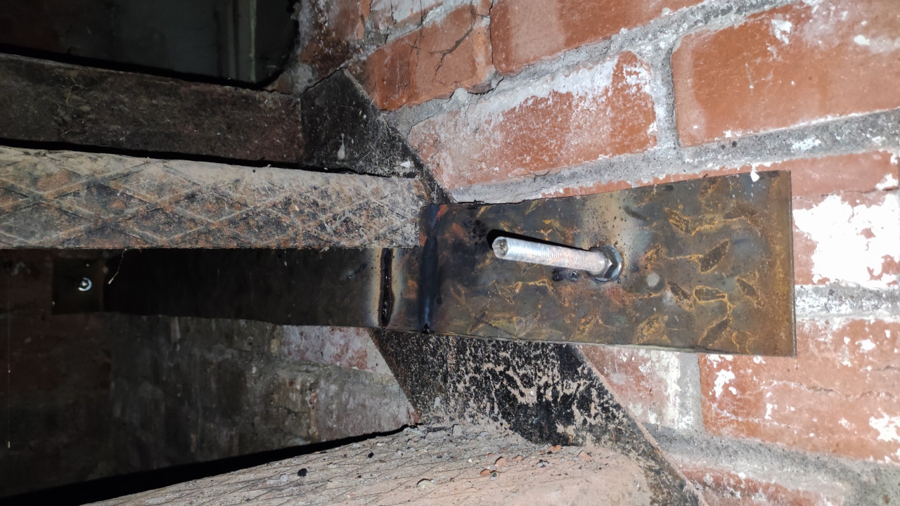 строительство ремонт реконструкция интерьер помещение узел крепления крепёж металлоконструкции балка стальная пластина резьбовой стержень шпилька гайка сварка сварные работы подпалины окалина кирпичная кладка кирпичная стена раствор швы пыль строительный мусор техническое помещение строительный контроль обследование конструкций монтаж усиление дефекты крупный план индустриальный интерьер деталиПохожие фотографии