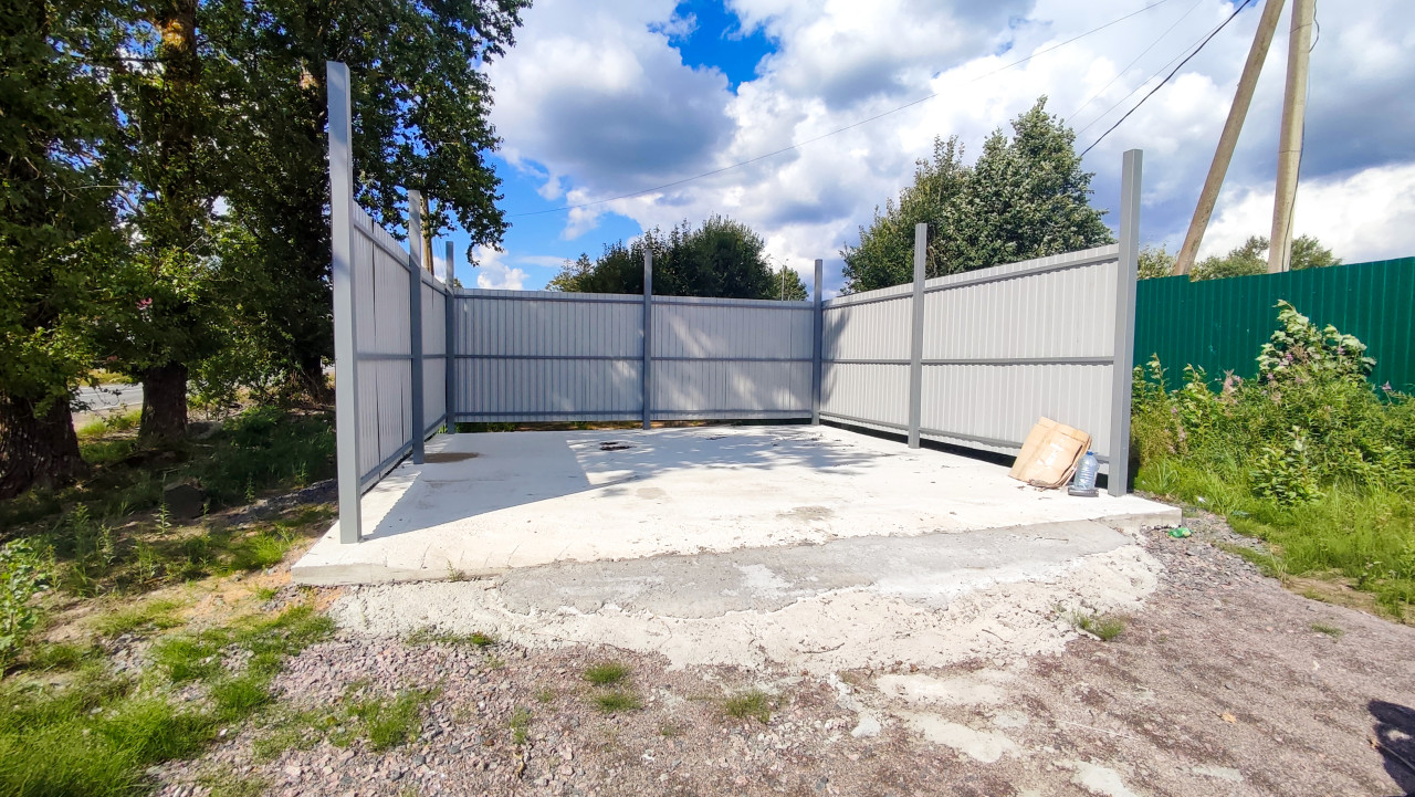 На снимке показана ограждённая площадка на открытом воздухе: светло-серые листы профнастила закреплены на металлических стойках, внутри лежит бетонная плита. По краям видны грунт и щебёночная отсыпка, вокруг растут деревья и кусты. Справа проходит зелёный забор, на дальнем плане заметны столбы и провода, а над ними облачное небо. На бетонной поверхности лежат кусок картона и пластиковая бутылка, подчёркивающие хозяйственное назначение места. Фото подойдёт для иллюстраций о благоустройстве территории, коммунальной инфраструктуре и организации площадок.