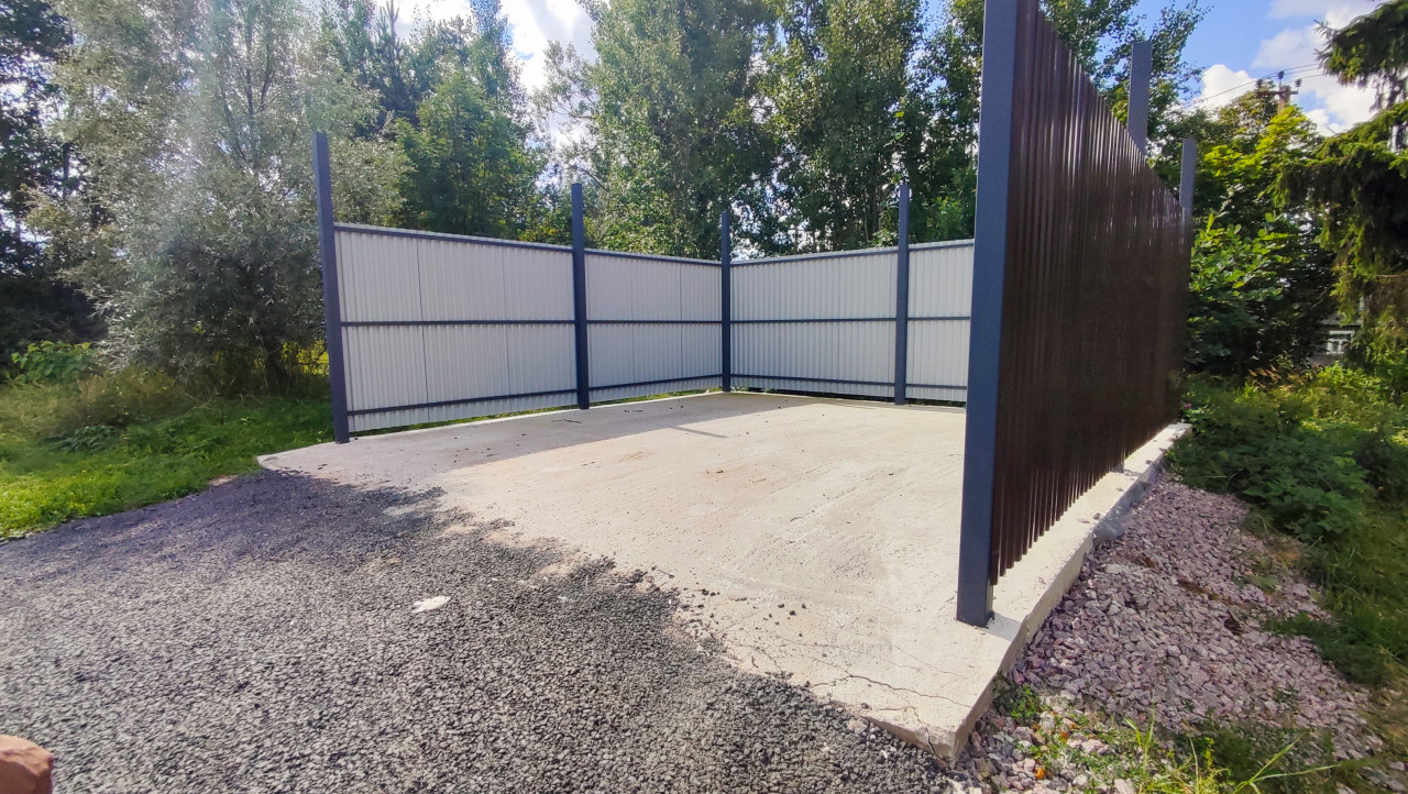 Ограждённая площадка из профнастила на металлическом каркасе с бетонным основанием среди деревьев
