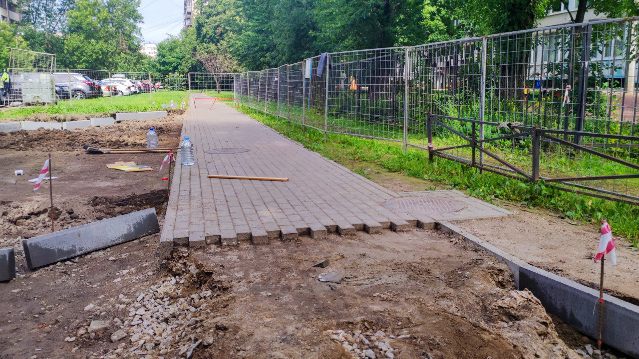 Снимок сделан на участке благоустройства: за временным ограждением формируют пешеходную дорожку, часть тротуарной плитки уже уложена ровными рядами, по краям установлены бордюры. На поверхности видны швы, участки незавершённой укладки и подготовленное основание, рядом лежат материалы и мелкие инструменты. В кадре присутствуют сигнальные элементы и дворовая среда с деревьями, освещение дневное, тёплый сезон читается по зелени. Кадр показывает процесс создания тротуара и этапы мощения. Фото подходит для материалов о ремонте тротуаров, благоустройстве и городских проектах.