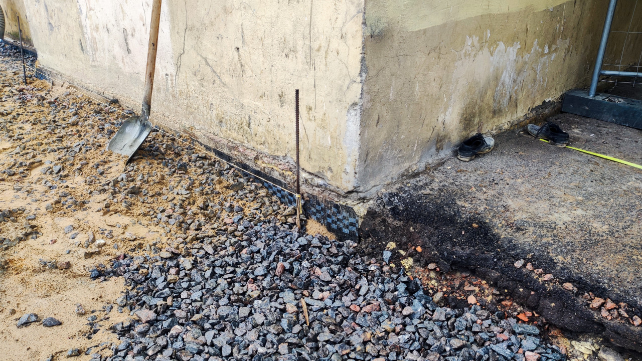 Ремонт цоколя и гидроизоляция у фундамента с щебёночной засыпкой и инструментами