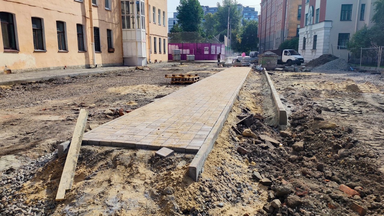 благоустройство благоустройство территории стройплощадка строительная площадка строительные работы строительство строительный участок двор укладка плитки тротуарная плитка тротуар пешеходная дорожка бордюр бордюрный камень материалы поддоны складирование грунт колеи ремонт двора ограждение временный забор безопасность пылеподавление водяной распыл жилой квартал многоэтажные дома городская инфраструктура ремонт тротуара подрядчикПохожие фотографии