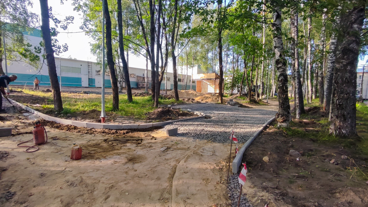 Благоустройство территории у здания с установленным бордюром и отсыпкой под дорожку в берёзах