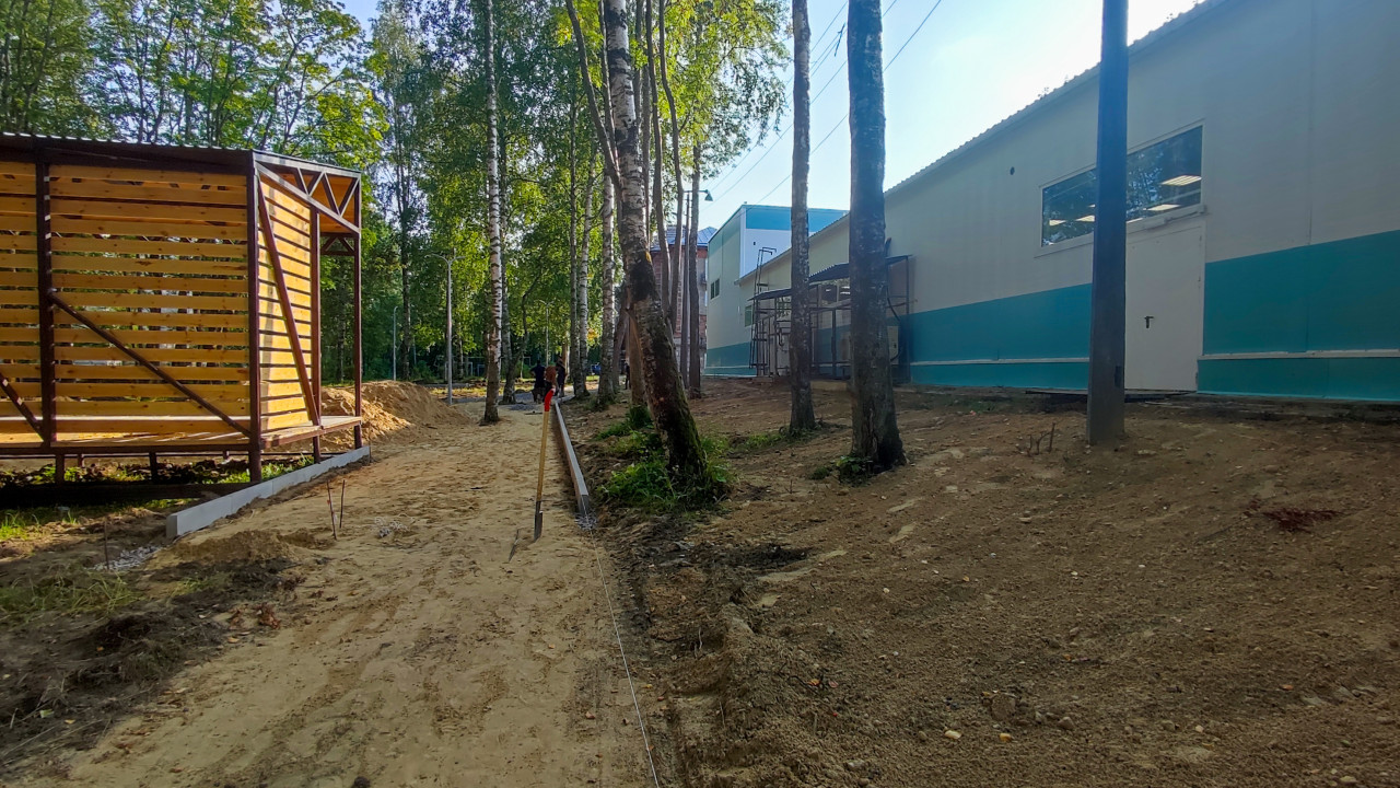 благоустройство благоустройство территории стройплощадка строительная площадка строительные работы строительство строительный участок тротуар дорожка пешеходная зона бордюр бордюрный камень материалы складирование организация работ отсыпка щебень песок грунт основание выравнивание ремонт инфраструктура территория у здания двор деревья березы зелень трава дневной свет ландшафтные работыПохожие фотографии