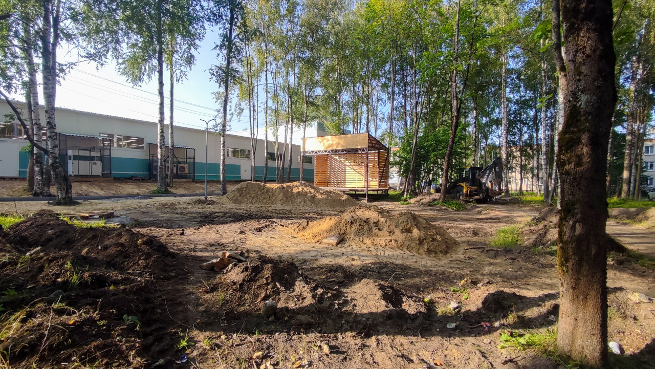 благоустройство благоустройство территории стройплощадка строительная площадка строительные работы строительство строительный участок тротуар пешеходная дорожка дорожка бордюр бордюрный камень основание подготовка основания отсыпка щебень песок грунт выравнивание ремонт инфраструктура городские работы территория у здания двор деревья березы зелень трава дневной свет ландшафтные работыПохожие фотографии