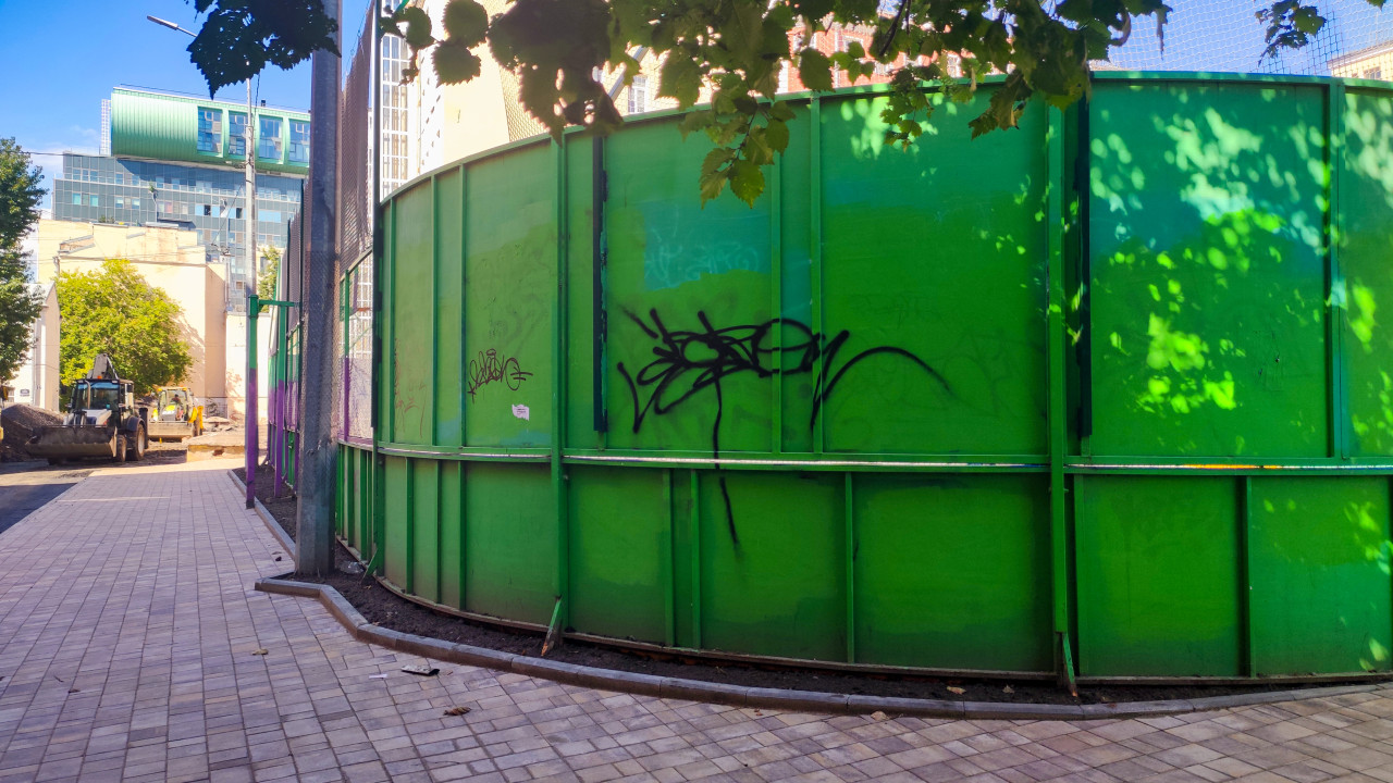 благоустройство благоустройство территории стройплощадка строительная площадка строительные работы строительство строительный участок инфраструктура городская среда двор дворовая территория спортивная площадка ограждение спортивной площадки забор металлическое ограждение секционный забор зеленый забор сетка защитная сетка граффити вандализм тротуар тротуарная плитка пешеходная зона бордюр общественное пространство безопасность организация территории тени от деревьев летний день строительная техника ремонт территории жилой квартал городские зданияПохожие фотографии