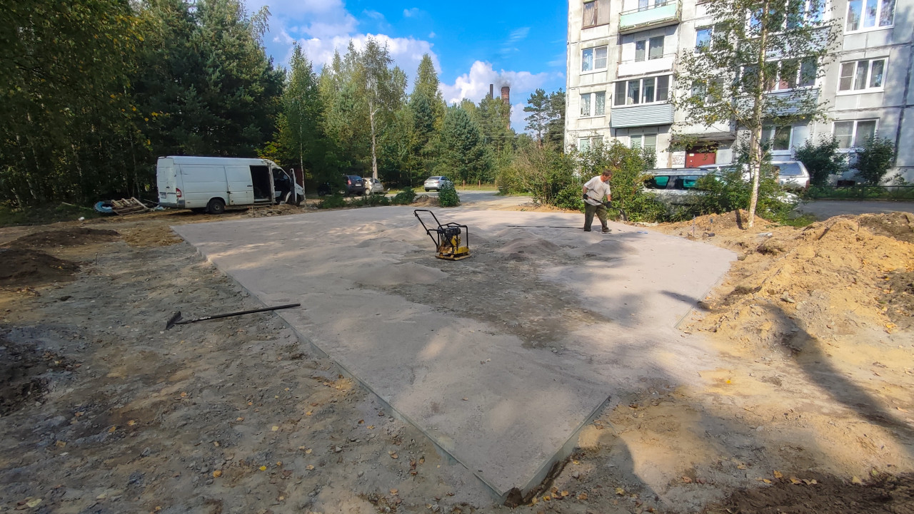 благоустройство благоустройство территории стройплощадка строительная площадка строительные работы строительство строительный участок город двор ремонт дорожные работы дворовой проезд основание дороги песчаная подушка песок отсыпка разравнивание виброплита виброуплотнение уплотнение грунта рабочий грабли лопата бордюр бордюрный камень земляные работы техника фургон панельный дом многоэтажка зеленые насаждения деревья тень летний деньПохожие фотографии