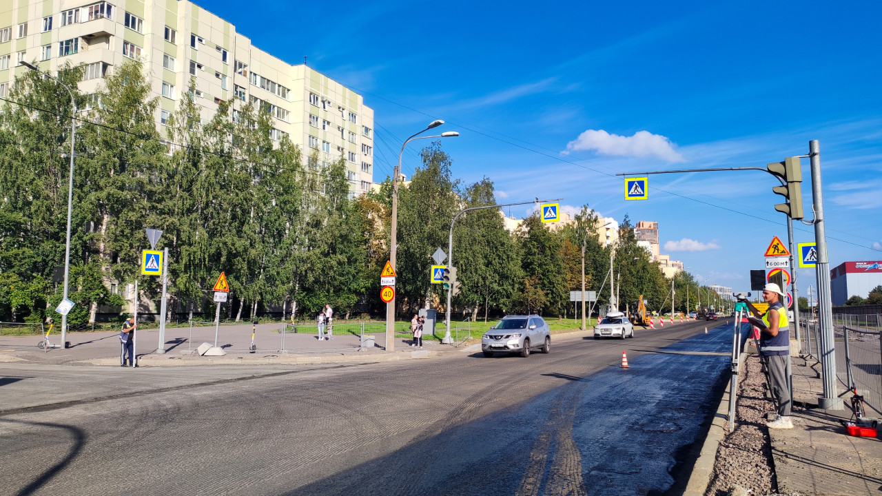 Широкая городская магистраль в процессе ремонта: справа снятый верхний слой покрытия и участки фрезерованного асфальта, выставлены конусы и временные ограждения, вдалеке работает дорожная техника. На переднем плане стоит геодезист в сигнальном жилете и каске, он наводит прибор на штативе для контроля отметок и трассировки. В кадре также видны светофоры, знаки пешеходного перехода, разметка, многоэтажные дома и поток автомобилей по соседней полосе. Снимок хорошо иллюстрирует технический надзор и организацию работ на проезжей части. Фото подойдёт для материалов о дорожных работах, геодезии и городской инфраструктуре.