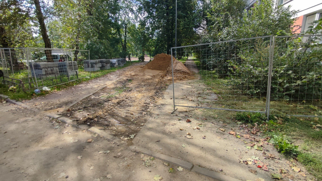 благоустройство благоустройство территории стройплощадка строительная площадка строительные работы строительство строительный участок город двор улица ремонт земляные работы временное ограждение забор секции забора куча песка песок следы техники колея грунт асфальт плитка паллеты бетонные блоки деревья кусты жилой дом тень солнечный день коммунальные службы ремонт дворовПохожие фотографии