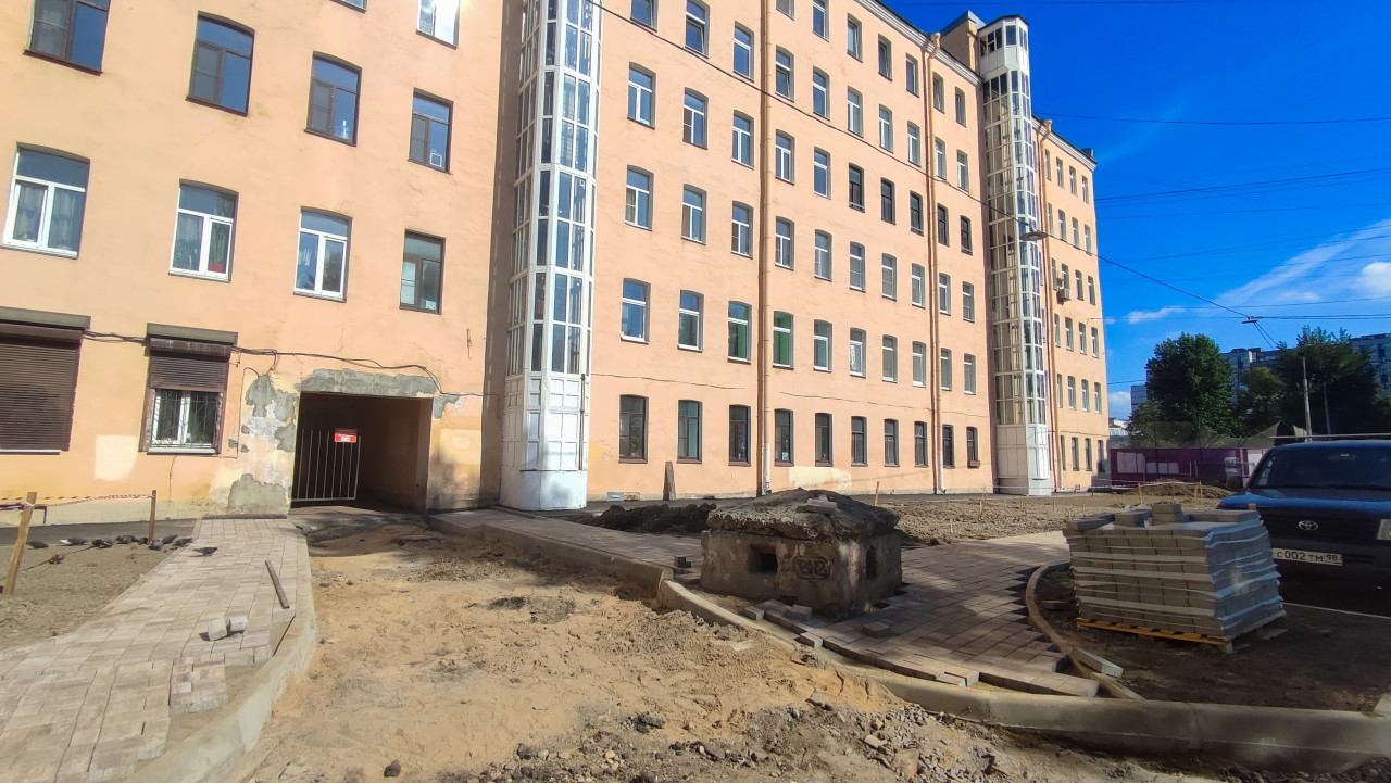 Фасад жилого дома и свежая тротуарная плитка на ремонтируемой придомовой территории