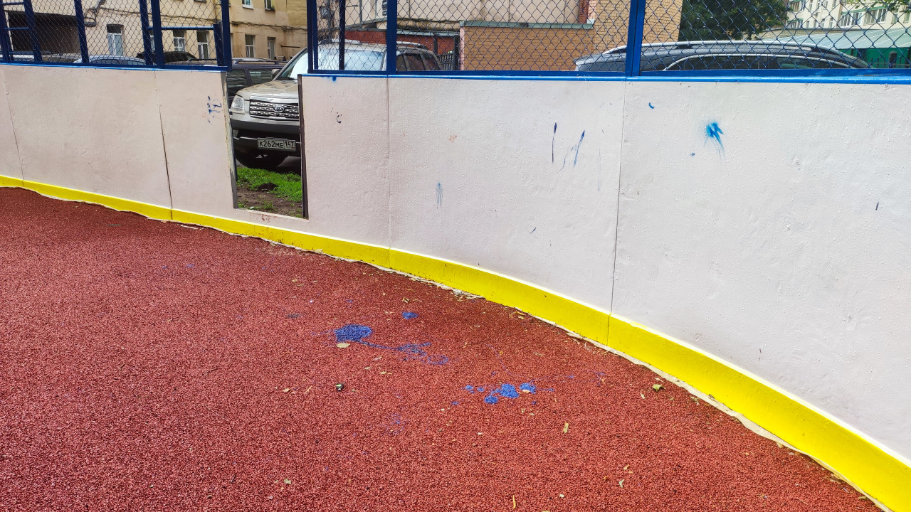 Пятна краски и потертости на бортах дворовой спортивной площадки
