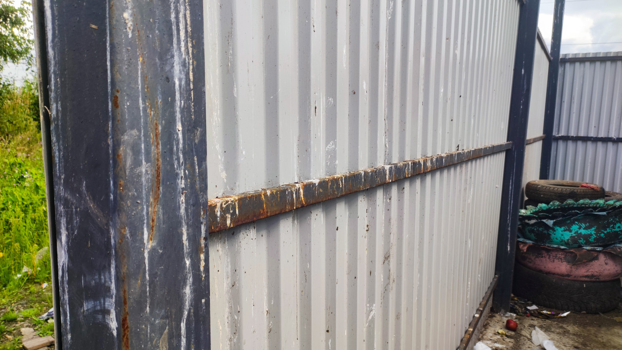 Складирование шин и мусора у профнастильного забора с ржавыми металлическими элементами